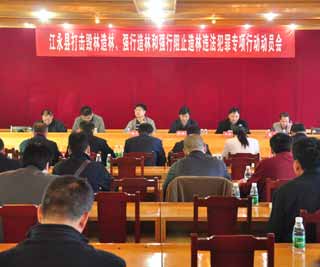 县委副书记张建坤在会上强调,各职能部门要加强领导,提高认识,下定决心,向各类毁林违法犯罪行为亮剑动刀,坚决维护正常的林业生产秩序;要明确分工,咬定目标,坚定信心,依法严惩各种毁林违法犯罪行为,确保全县森林资源得到有效保护;要宣教结合,营建氛围,保持恒心,抓好宣传发动教育、重点案件查处和巩固整治成效工作,巩固“绿色江永”建设成果,推动全县林业经济健康持续发展。县委常委、县委办主任陈小平,副县长刘志强,县政协副主席余季平,千家峒国家森林公园管理局、高泽源林场党委书记龚峰参加会议。