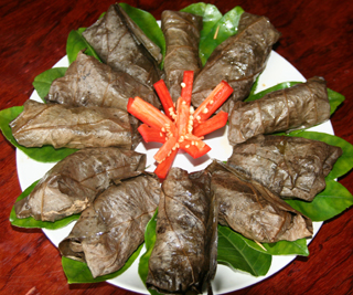 双叶抱子又名叶生满堂,是瑶家女儿回娘家祝寿时必上主菜。主要用五花肉、花生、板栗、荷叶、柚子叶、蒸肉米粉等材料做成,荷叶、柚叶的清香扑鼻,五花肉软绵入味,配上花生、板栗,油而不腻。
