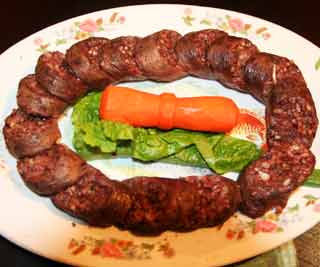 长(肠)相聚,是千家峒瑶民过年时必做的佳肴,寓年年长久相聚之意。主要用猪大肠、猪血、炒米、香芋、姜、蒜等等材料做成,用猪头骨煲汤后取出骨头,将腌制好的原料放入汤中熬煮30分钟即可食用,松软可口,香味浓厚。