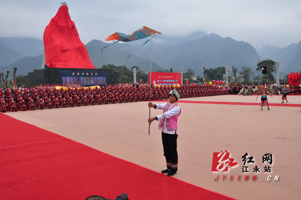 山高水长瑶家缘,五洲瑶胞聚江永。情深意重汇瑶乡,四海欢歌颂和谐。江永县千家峒是瑶族祖居故地之一,是瑶胞千百年来的乐土。元大德九年发生的千家峒事件,瑶民被迫逃离故土,七百年后“长鼓铜铃歌不断,子子孙孙要回源”的瑶歌,唱出了瑶胞寻根归峒的共同心声。各瑶族代表团及湘桂粤三省(区)12个县区的瑶族同胞和江永瑶汉人民欢聚千家峒,举行一次规模空前的世界瑶族大聚会,共同奏响了一曲和谐盛世欢歌。