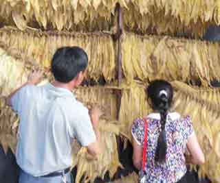 图:烟农查看烘烤烟叶。周瑛鸿/摄