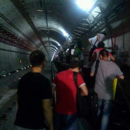 2013年9月8日晚,杭州地铁一趟列车在钱塘江底下的隧道中“趴窝”了。列车上的113名乘客,只能沿着地铁隧道里1.2米宽的栈道走出来,足足走了半个小时。(新华网)