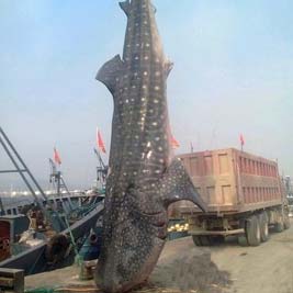 日前,山东日照市岚山区一渔民在海上捕鱼作业时,发现一条已经死亡的鲨鱼,随后用渔船将其拖回渔港。“我捕鱼这么多年还没见过这么大的鱼呢”,据目击者称,该鲨鱼长10米左右,重达约两万多斤,用吊车吊至长货车才把这“庞然大物”运走。该渔民以10元每斤的价格售出,共卖得202000元。(中国网)