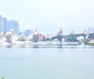 图:张家界最后一座石拱大桥爆破拆除。8日,地处湖南省张家界市中心城区的澧水大桥被成功爆破拆除,这座承载了40多年风雨的大桥终于结束使命。爆破拆除后,将在原址上重建新桥,新桥计划于2017年2月建成通车。(中新网)