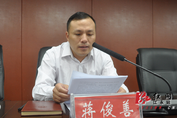 图:县委常委、纪委书记蒋俊善作全县第三季度优化经济环境和机关效能建设、作风建设工作分析报告。