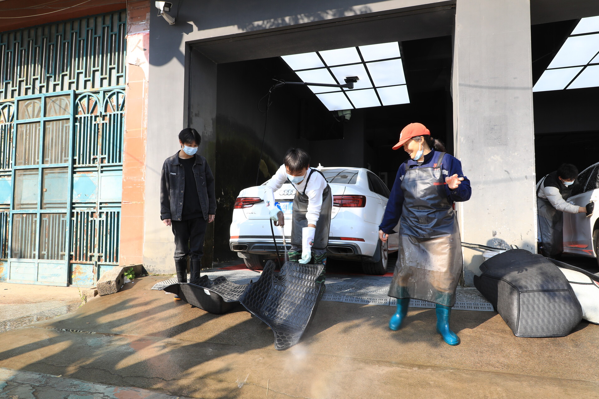 在江永县洗之郎汽车私人订制服务点内,专业技师指导职中学生进行高压水枪冲洗、洗车液精细擦洗、内饰除尘养护的标准化流程作业,每个步骤都有条不紊,不到二十分钟,车辆便焕然一新。