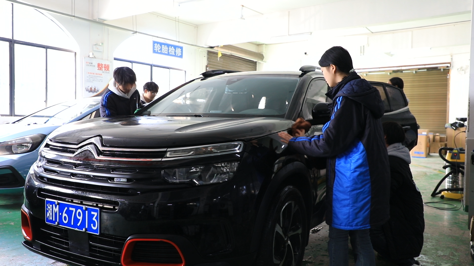 另一边,江永县职业中专学校的校内服务现场同样热火朝天。学生们分工明确、配合默契,喷水、打泡沫、擦拭车身、添加玻璃水、测试胎压,一系列操作娴熟规范,展现出扎实的技能功底。