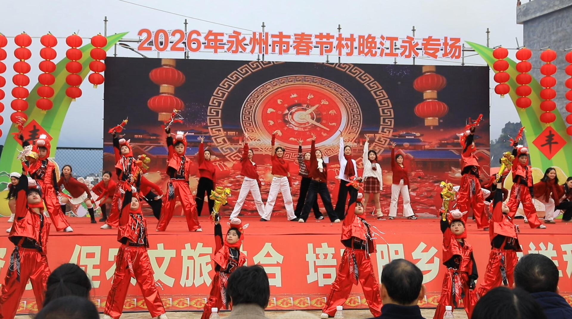 江永融媒2月2日讯(记者 谢文彬)龙腾狮舞庆佳节,瑶乡欢歌话振兴。1月31日,由永州市委宣传部、市文化旅游广电体育局、江永县委、县人民政府联合主办的“聚乡村资源促农文旅融合”2026年永州市乡村春节村晚(江永专场)在兰溪瑶族乡棠下村火热上演。