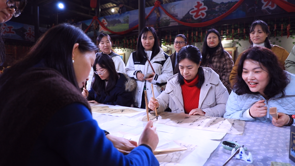 在勾蓝瑶寨,大家漫步古朴青石板路,参观瑶族传统古建筑,在瑶族文化展厅、女性文化体验馆等沉浸式领略瑶汉文化交融的独特魅力。国家级非遗女书传承人胡欣现场教学,大家学写女书、DIY女书文创,在一笔一画间感受千年前女性创造文字的智慧与力量。在勾蓝瑶寨“洗泥晚宴”上,大家积极参与“竹竿舞”“你比我猜”等互动节目,现场欢声笑语不断,进一步增进了交流、凝聚了团队合力。
