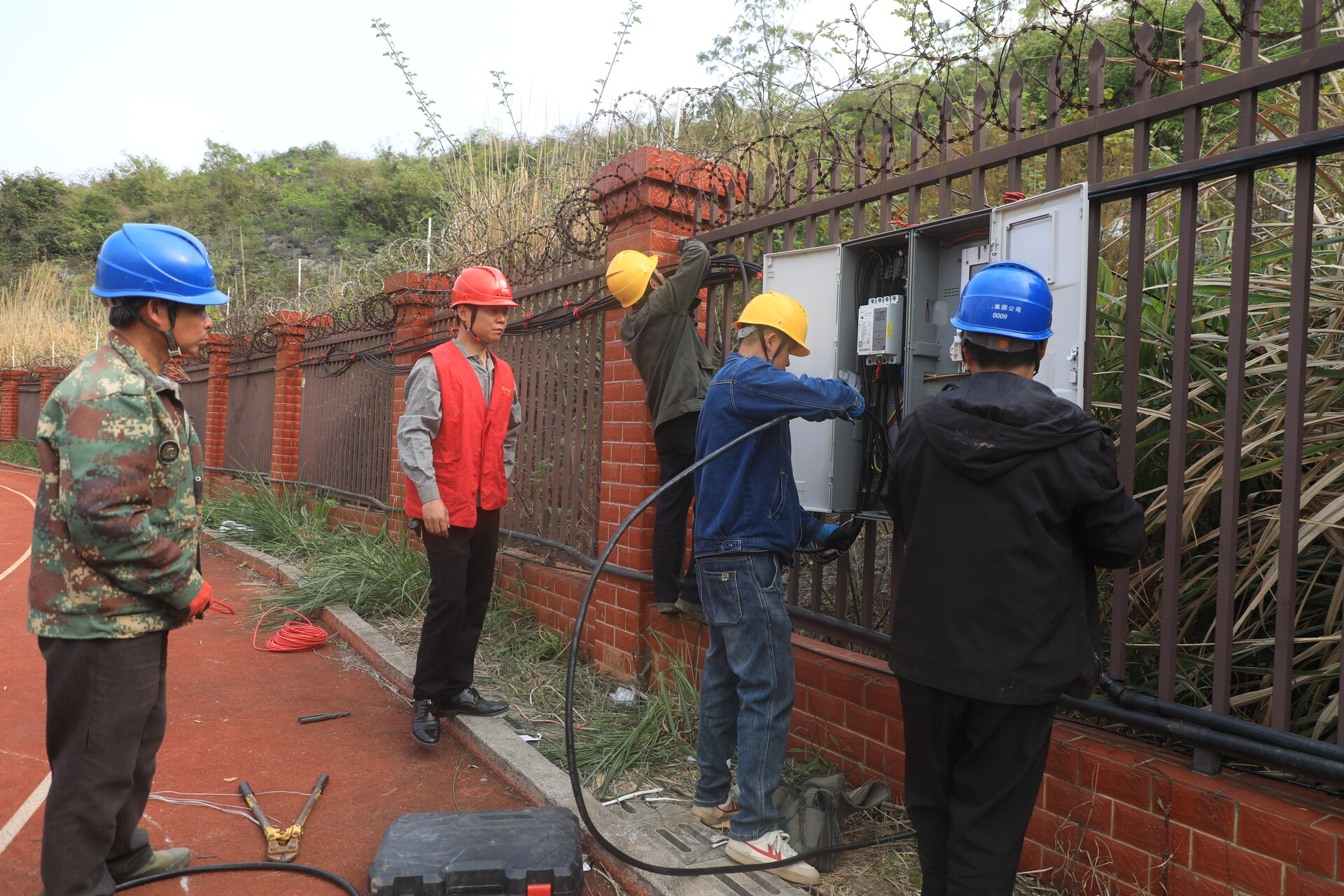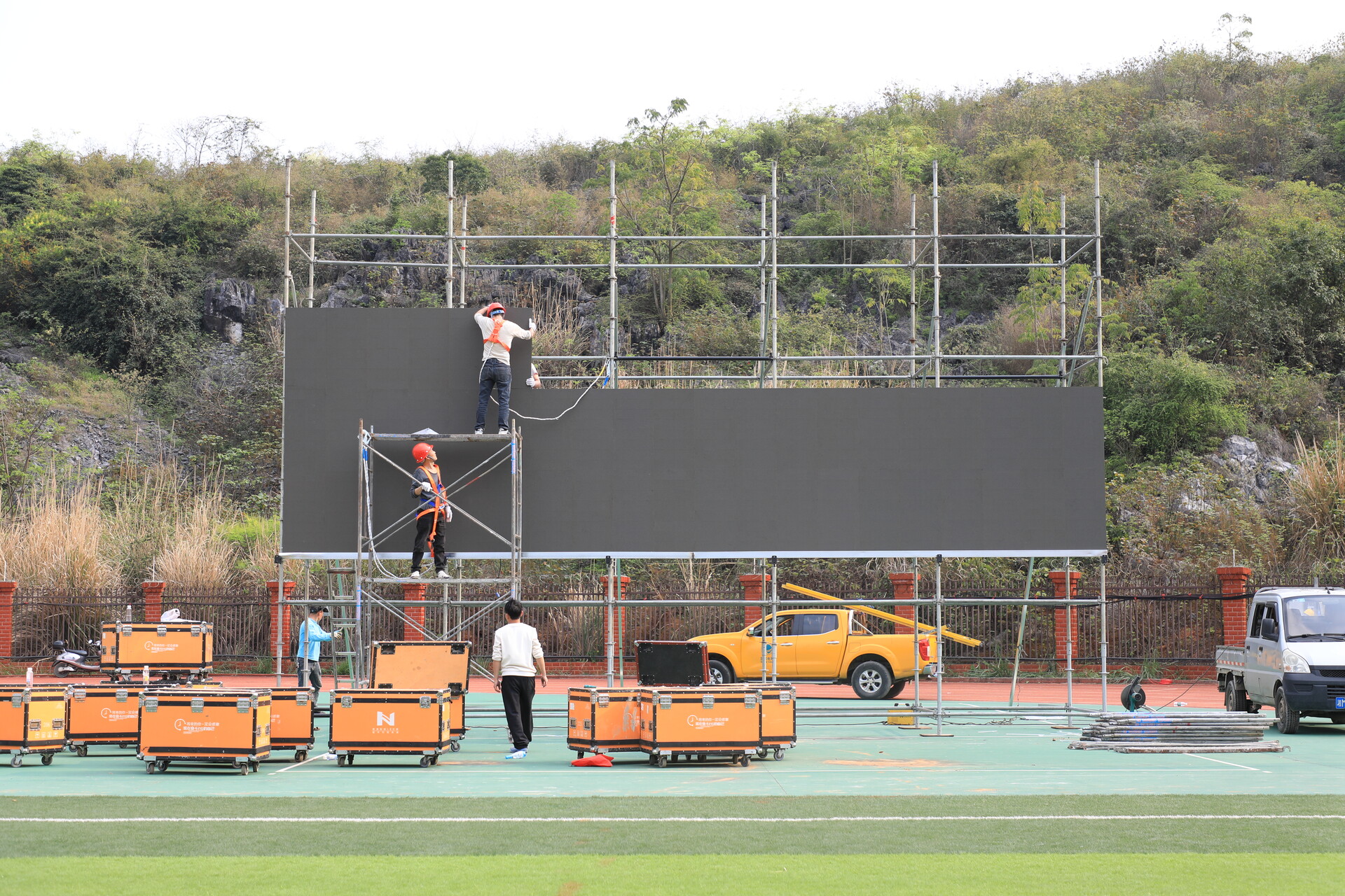 大屏安装稳步推进,国网江永县供电公司也同步布设低压供电线路、安装配电设施,并配备发电机作为备用电源,全力保障大屏及赛场用电稳定。