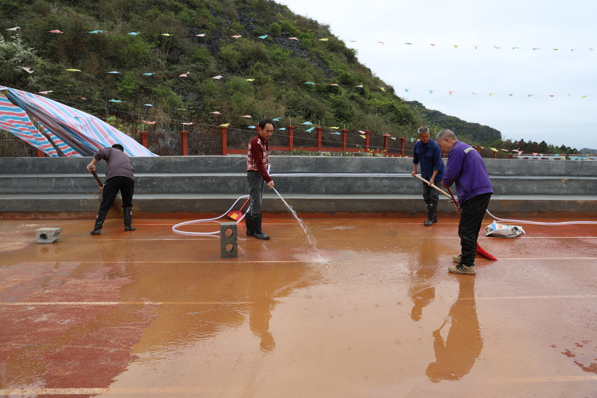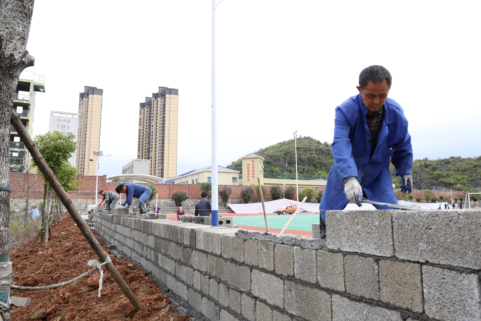 现场施工负责人义永增介绍,目前正在进行砌砖、批灰作业,接下来将进行滚墙漆施工。他们正加班加点,确保在开赛前完工。这里是永州永超的江永主场,无论如何都要保证工程质量,不能给江永丢面子。