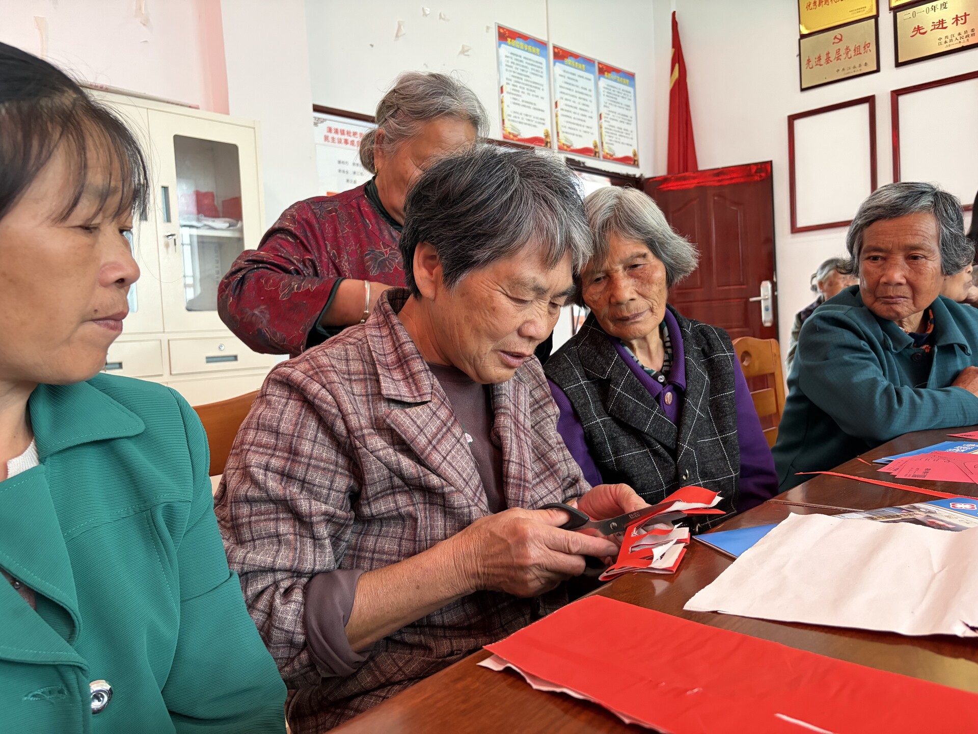 活动现场暖意融融、秩序井然,结合谷雨节气习俗与江永本地文化特色,精心设置了剪纸非遗体验、趣味套圈、蒙眼敲锣三大核心环节,兼顾非遗传承与娱乐性。老人们指尖翻飞间,一张张红纸逐渐变成造型精巧、寓意美好的剪纸作品,脸上满是成就感。