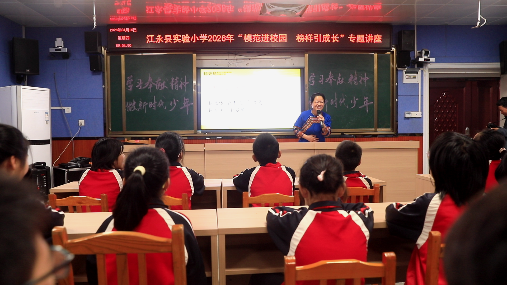 江永融媒4月17日讯(记者 欧阳文 通讯员 翟媛 蒋权座)4月16日,江永县实验小学特邀全国模范教师盘晓红校长走进校园,开展“模范进校园 榜样引成长”专题讲座,全校师生分批次参与学习,在榜样精神的浸润中汲取前行力量。