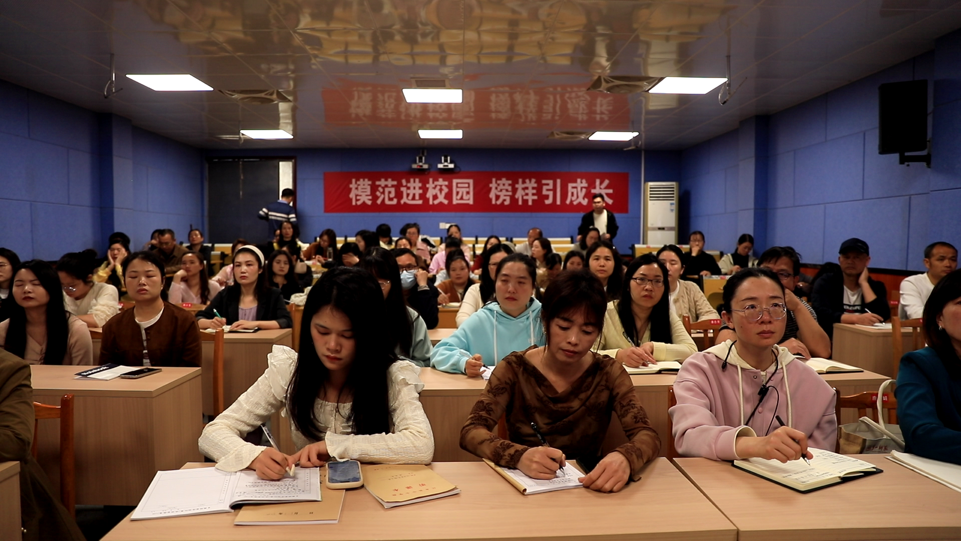 在与全体教师的专题分享中,盘晓红以“做身心健康、人格健全的教育者”为核心主题,开展了一场兼具专业性与实用性的成长讲座。她围绕教师身心健康调节、健全人格塑造两大核心,结合一线教育教学中的实际困惑,从情绪管理、压力疏导、职业认同等多个维度,分享了科学的调节方法与实践经验。