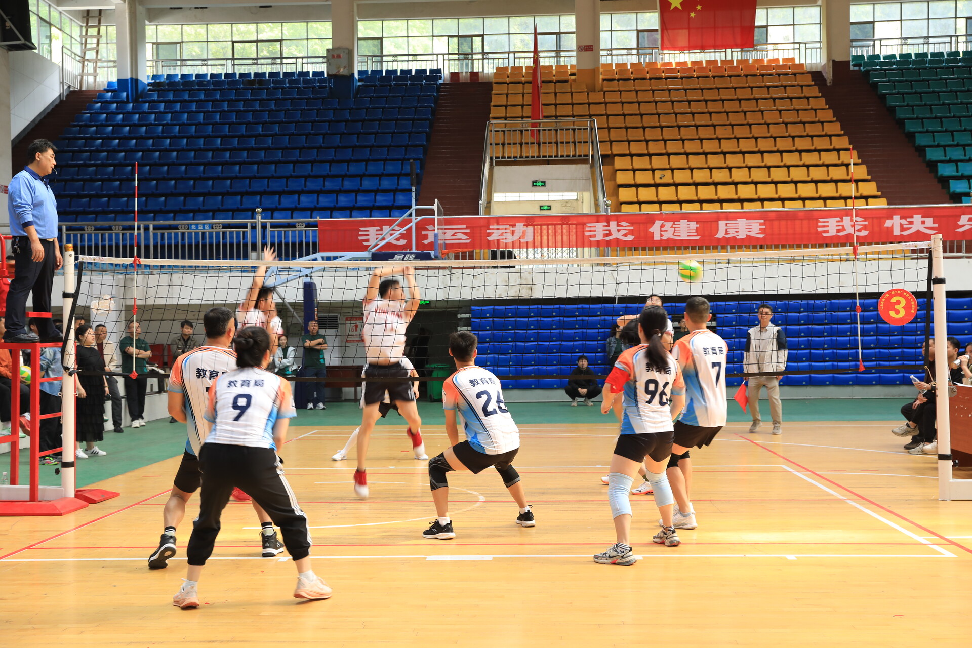 平日里伏案工作、执笔耕耘的教育工作者们,换上运动装走上球场,发球、扣杀、拦网、救球,动作利落、配合默契,每一分都全力以赴。全体参赛队伍严守规程、奋勇争先,生动诠释了团结拼搏、永不言弃的“永冲锋”精神。