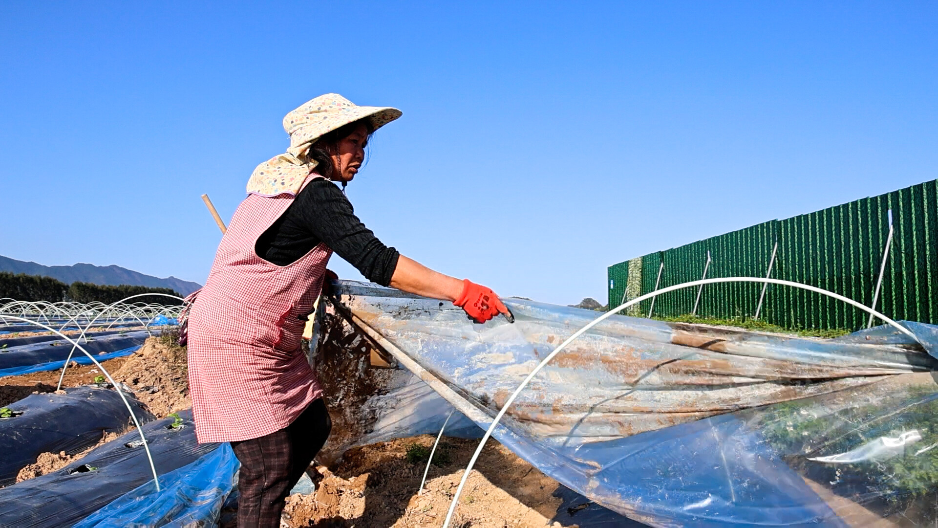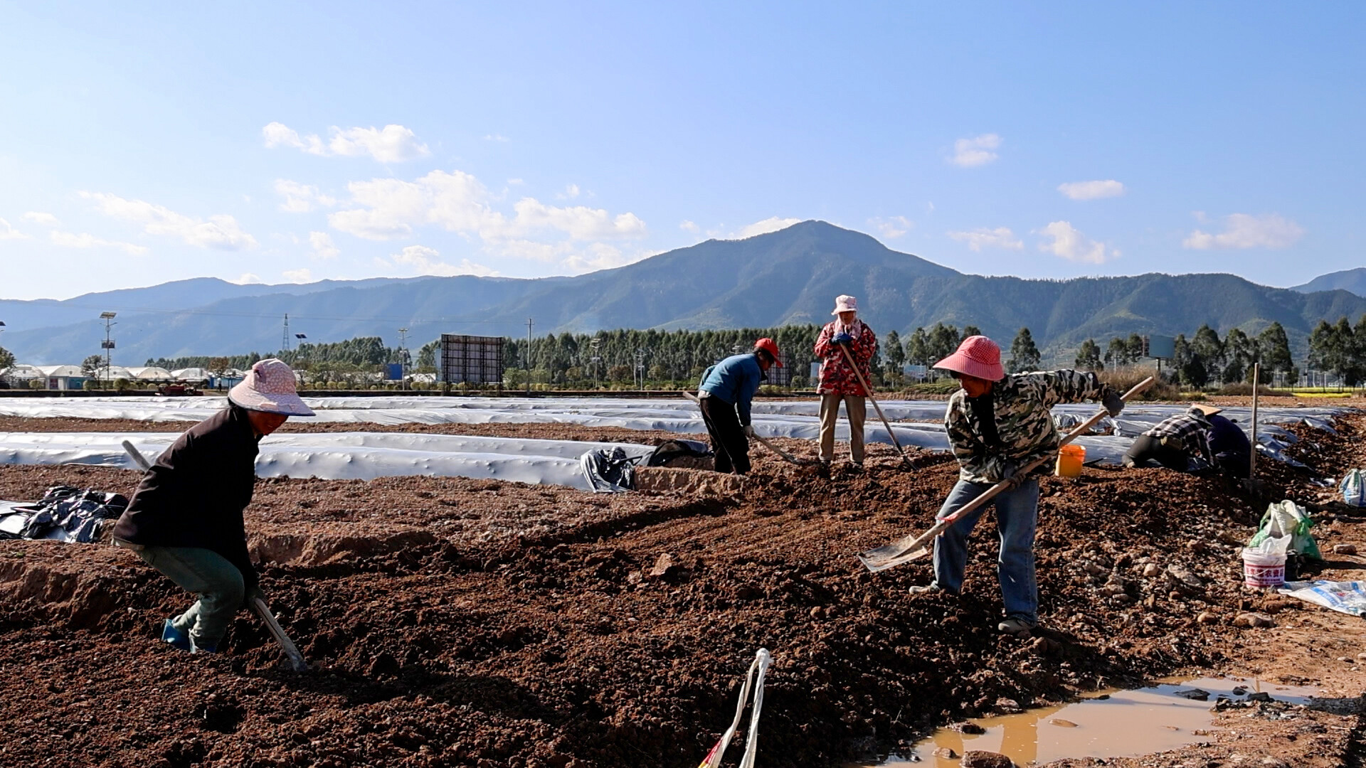 在新扩基地,挖掘机来回作业、机械轰鸣,基地负责人张永正带着村民撒施有机肥、清沟松土、规整田块,抢抓农时改良土壤、培肥地力。另一边,村民们细心为蔬菜幼苗覆盖地膜,保障苗期生长。