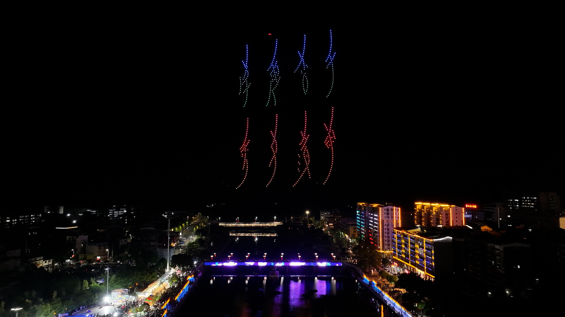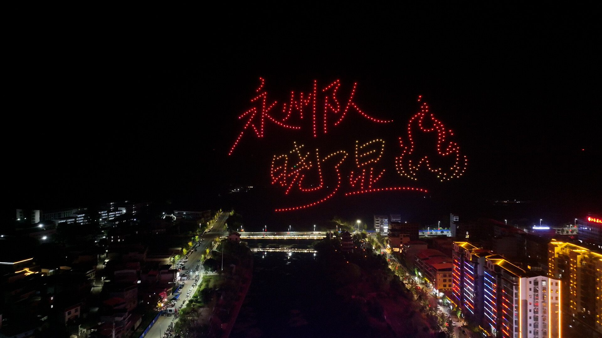 江永融媒10月27日讯(记者 毛磊 陈丽华 唐宇)10月24日至26日,江永县滨河广场上空,数百架无人机以天为幕,在特色农产品推介会暨非物质文化遗产美食节期间连续上演星空大秀,将神秘“女书”文化、浓郁瑶族风情与“湘超永州”足球精神绘入夜空,为市民游客带来震撼心灵的视听盛宴。
