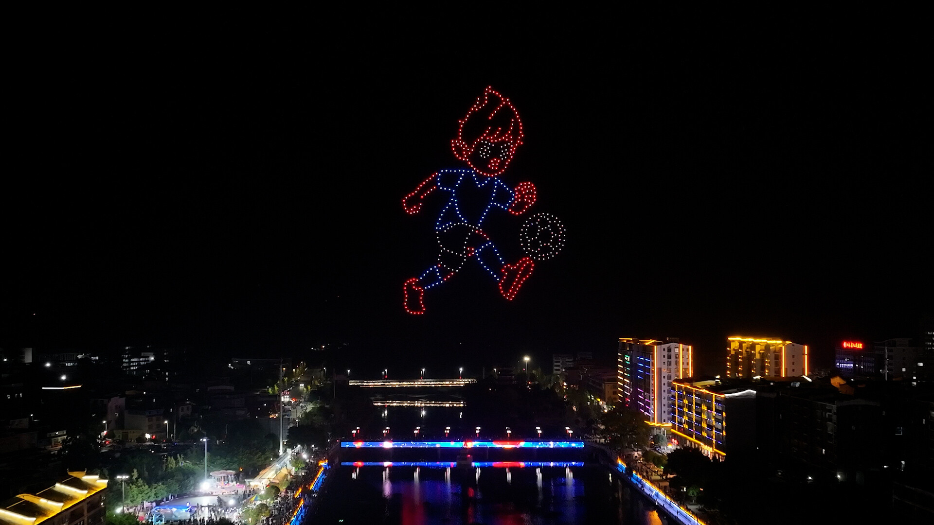 夜空中,数百架无人机腾空而起,依次点亮娟秀的女书字符、绚秀的瑶族图腾等图案,随后“湘超永州”“永州队晓了显火”等字样与绿茵场奔跑球员形象跃然夜空,科技光影与本土文化碰撞出震撼视觉效果。
