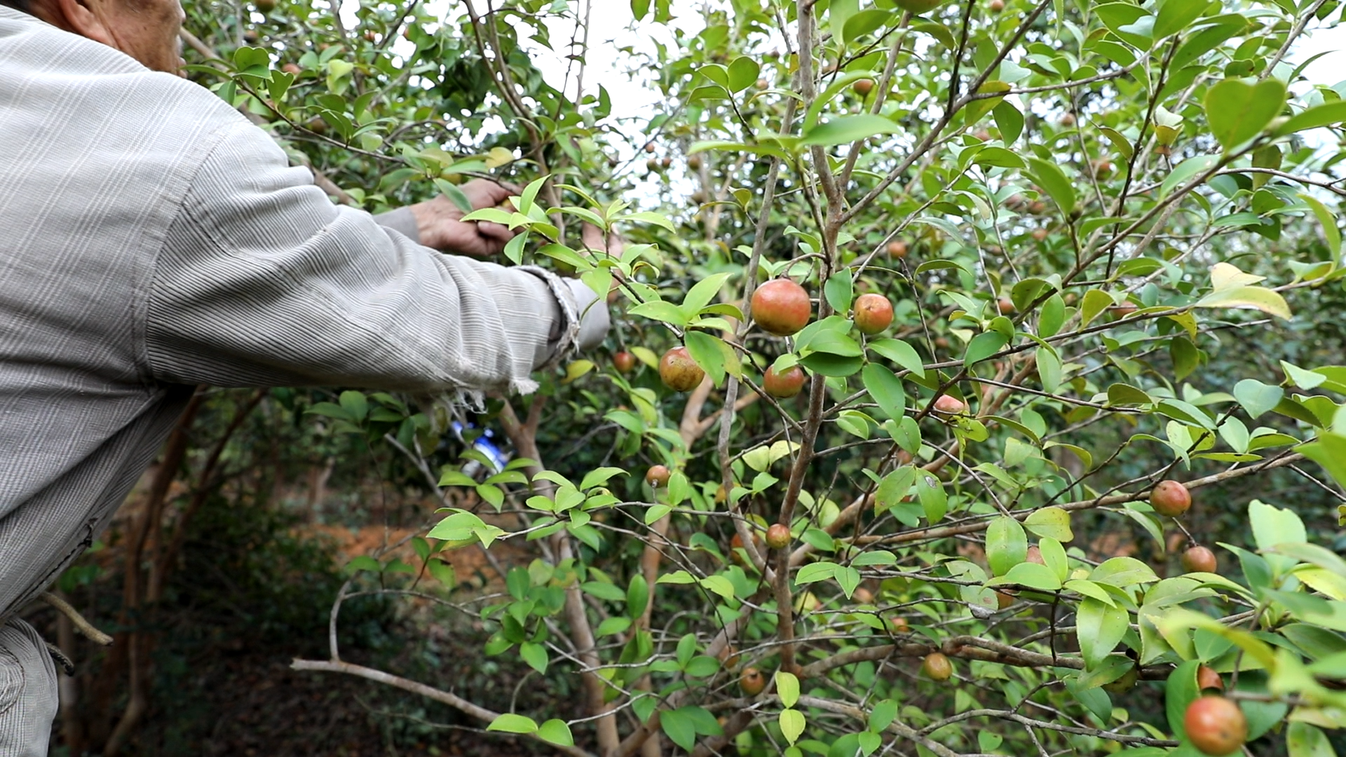 清晨6点,身背竹篓的村民们便已踏着露水上山,穿行于油茶林中,放眼望去,成片的油茶树枝繁叶茂,村民们手法娴熟地采摘着枝头饱满的油茶果,山野间一派繁忙景象。