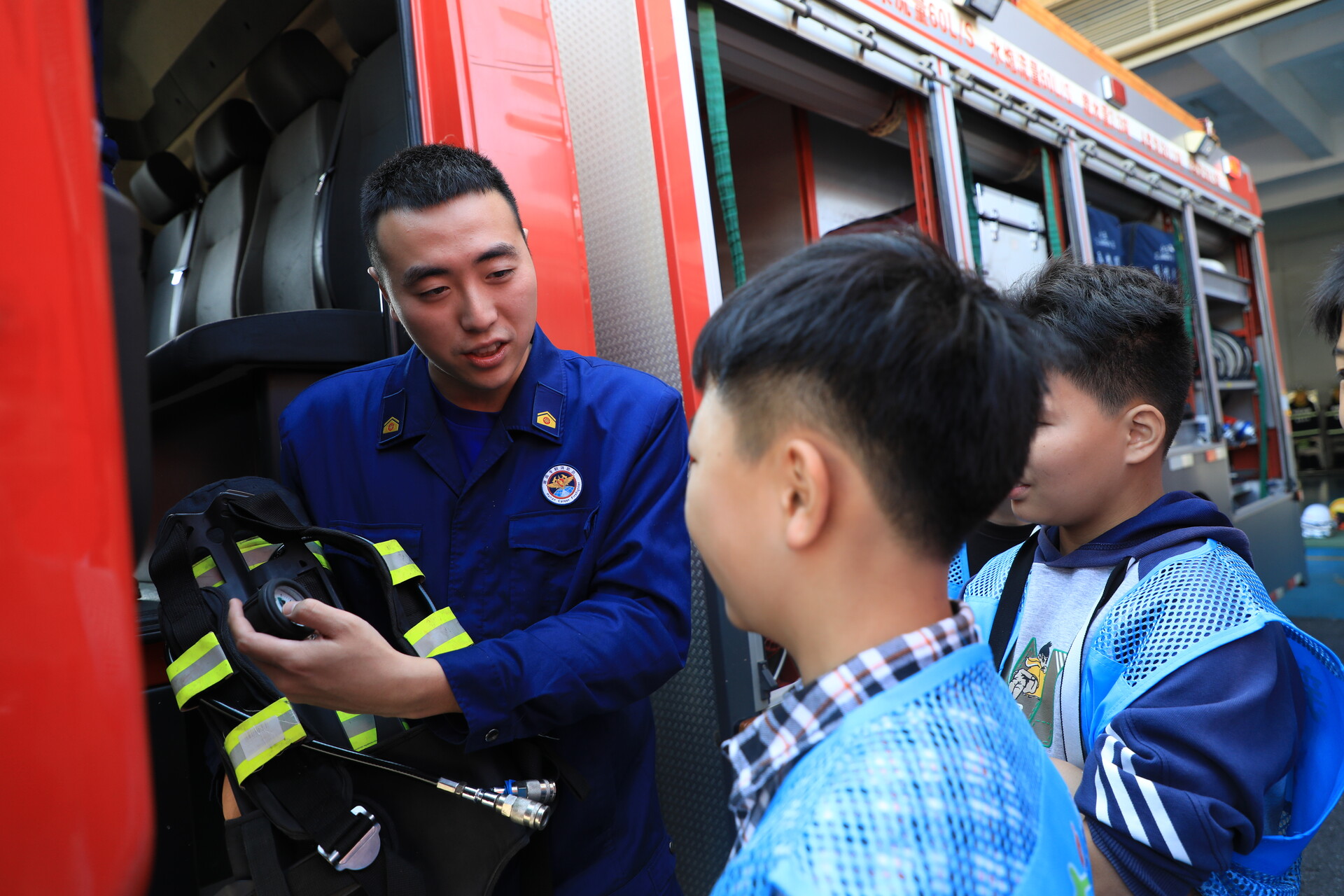 活动首站由江永县消防救援大队全力支持,消防员化身“安全导师”,详细讲解了水罐消防车、抢险救援车功能,演示风力灭火机、消防水枪、液压破拆工具等装备用法,还调配云梯消防车让孩子们体验高空救火视角;消防宣传员结合真实案例,通过讲解火灾警示、灭火器使用、消防标志识别等互动环节,帮助孩子们掌握报警、防火、逃生技巧,进一步筑牢了安全防线。