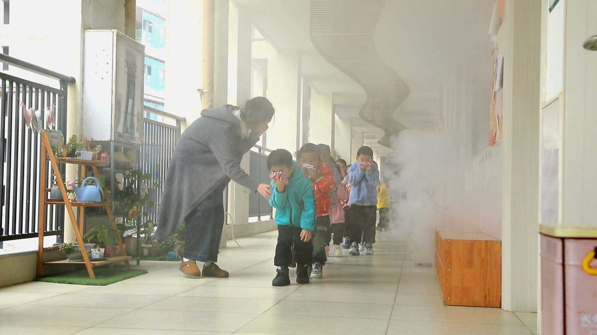上午10点,演练正式启动。各班教师迅速组织幼儿用湿毛巾捂住口鼻,弯腰低姿,按照预定逃生路线,避开烟雾区域,快速、有序地向操场安全地带疏散。整个疏散过程中,教师们全程引导、护佑在幼儿左右,提醒孩子们不推挤、不慌张。全体师幼均安全撤离至指定区域,清点人数后无一人遗漏。