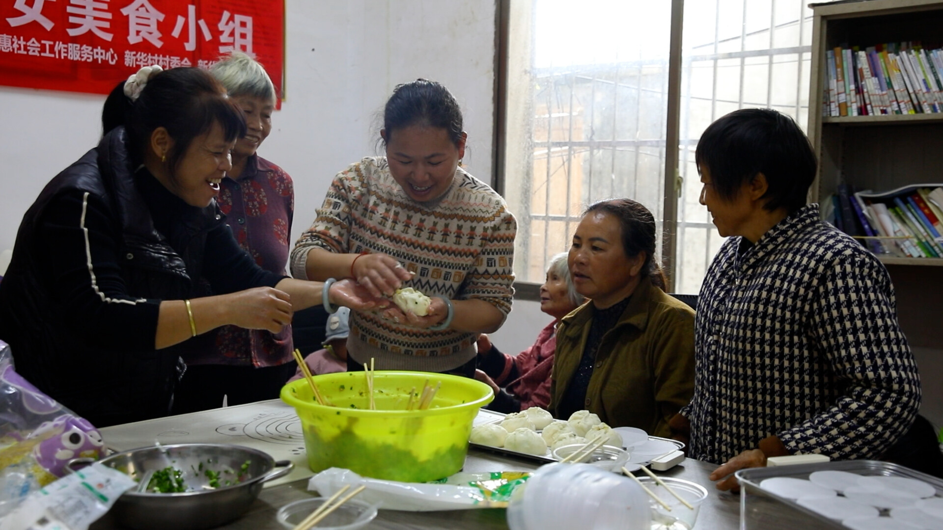 活动现场热闹非凡,社工与村民们分工明确、默契配合。切葱、揉面、调馅、包包子、做烤饼,大家有条不紊地忙碌着,不一会,一个个形态饱满的包子、香气四溢的肉饼逐渐成型。劳作间隙,大家交流烹饪技巧,分享生活点滴。
