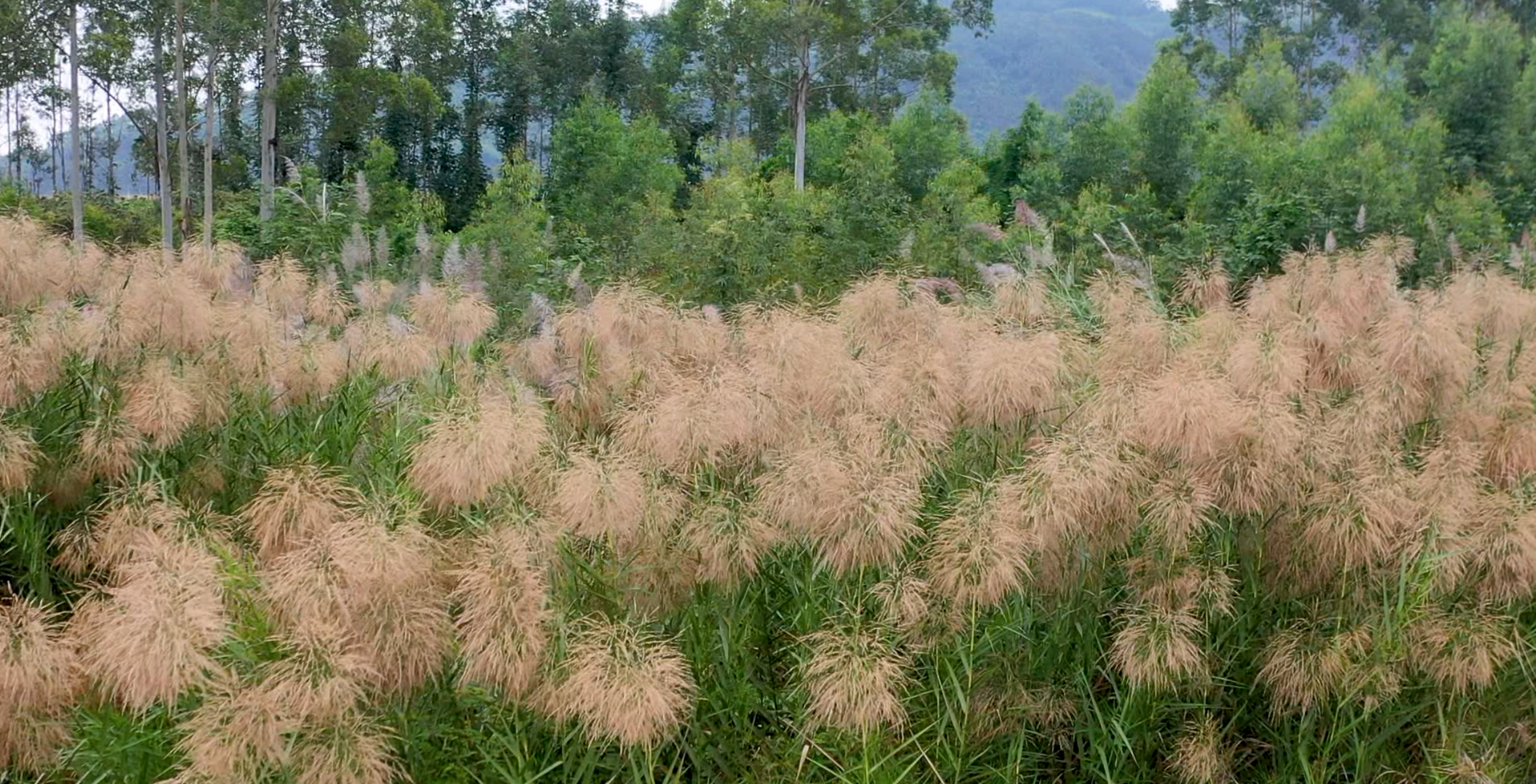 斑茅多生于河岸溪涧湿地环境中,它的根系十分发达,具有很好的固沙作用。初开时,斑茅的花序呈紫红色,成熟后的花序就会像棉花糖一样,呈白色。在阳光的照耀下,斑茅花上金丝绒般的细绒毛反射出迷人的光彩,与远山、河流、房屋共同构成一幅充满诗意的自然美景图。
