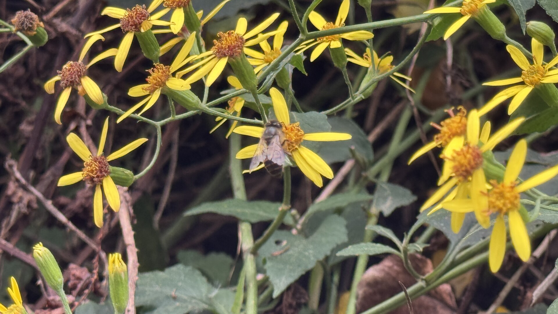 除了扮靓冬日乡村,千里光还是冬季里重要的蜜源植物之一。在暖阳的照耀下,不时能看到蜜蜂穿梭在花丛间采蜜,成为冬日乡村里一道灵动的风景线。